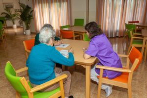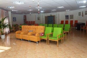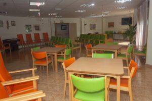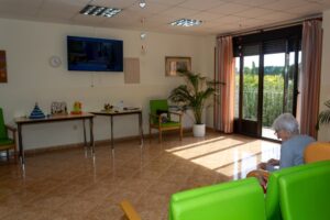 Sala amplia y muy luminosa, equipada con televisión y mobiliario confortable. Ideal para socializar, ver la televisión o participar en actividades grupales.